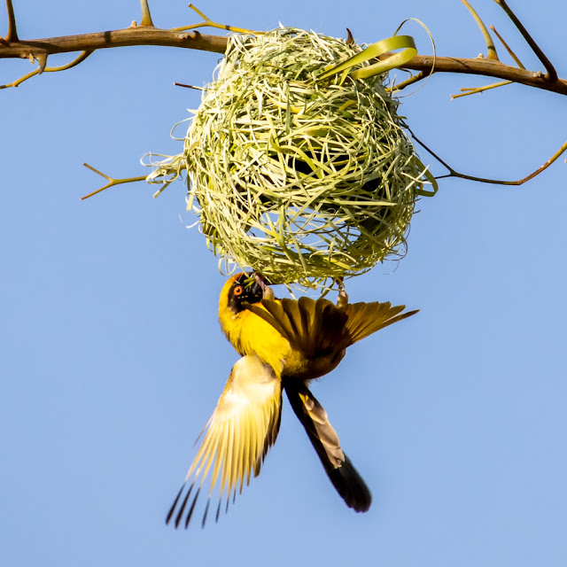That bird was just visiting but we have some that set up home in our garden for a while. Among those is a strange little weaver bird which keeps constructing nests, then demolishing them and starting new ones. Here he is hard at work constructing one of his early nests in August 2021.